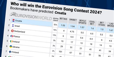 Semi-final 2 Odds Eurovision Song Contest 2026 Top 10 These countries are currently favourites to win Eurovision ... Oddsen Who wins the Eurovision Song Contest 2026? Odds comparisons at Eurovision Song Contest 2026. No odds are currently available for this event . If you think this is an error at our end let us know. Popular Bets. Karen Carney. Strictly Come Dancing. Eurovision 2026 Probability of winning (odds) The chart shows the probability of winning the Eurovision Songcontest for every participating country. The vertical scale is logarithmic. This is done because … Eurovision 2026 - National Selections - Luxembourg Song Contest 2026 Betting & Odds Bet on Eurovision 2026 - National Selections - Luxembourg Song Contest 2026 and choose among options … Oddstips: Danmark kvalifiserer seg til finalen (1.95 @ Winnerz). Den danske representanten har en vakker sangstemme, men dessverre var verken antrekket eller ... Eurovision Odds 2026: Beste Odds på ESC 2026 🇱🇻 Supernova 2026 odds launched 🇱🇻 : r/eurovision