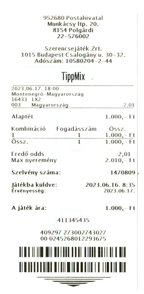 Fedezd fel, hogyan működik a Tippmix kombinációs táblázat, és tanulj meg okosan fogadni kalkulátorokkal, példákkal és hasznos tippekkel! Nyereményjáték leírása Mindazon 2026. február 12. és március 3. között vásárolt Tippmix szelvények, amelyeken legalább 3.000 Ft értékű, minimum 3-as kötésű … Nyeremények Tippmix 2026. Augusztusi Tippmix akció. 2026. augusztus 18 - 31. között befizetett játékok közül kisorsolt ráadás nyertesek. Sorsolás napja: 2026. szeptember 4. 2026. Novemberi Tippmix nyereményjáték 16 Nov 2026 — Sorsolás napja: 2026. november 20. Nyereményigénylési határidő: 2026. december 30. (kedd) ... átutalásra a játékos által a nyereményigénylési ... Tippmixen az augusztus sem fullad unalomba! Legális online sportfogadás minden mennyiségben a Tippmixpro.hu-n! Fedezd fel a végtelen lehetőségeket és nyerj.