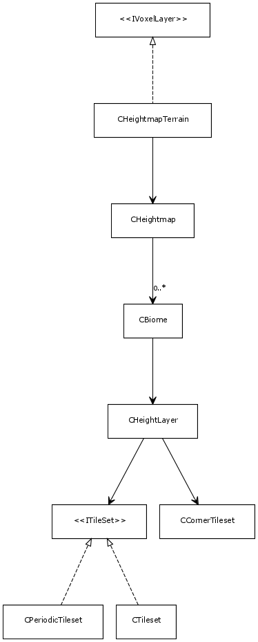 This is structured as follows: The CTerrainHeightmap object does the actual voxel generation for the terrain. It is linked to a CHeightmap object.