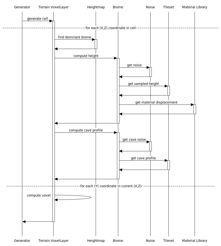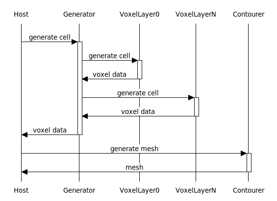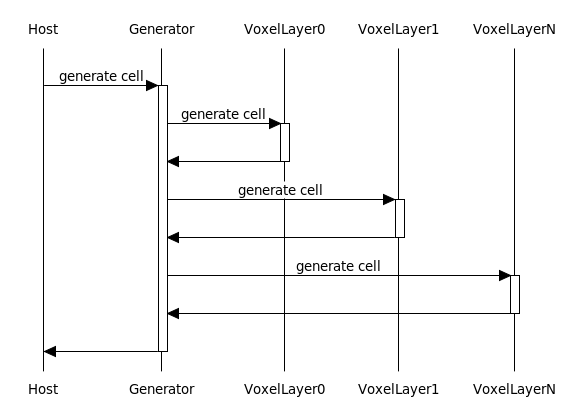 The sequence begins when the generator calls the getCountourData() method from the IVoxelLayer to the CHeightmapTerrain object. This is a request to generate the voxel data for the specified cell.