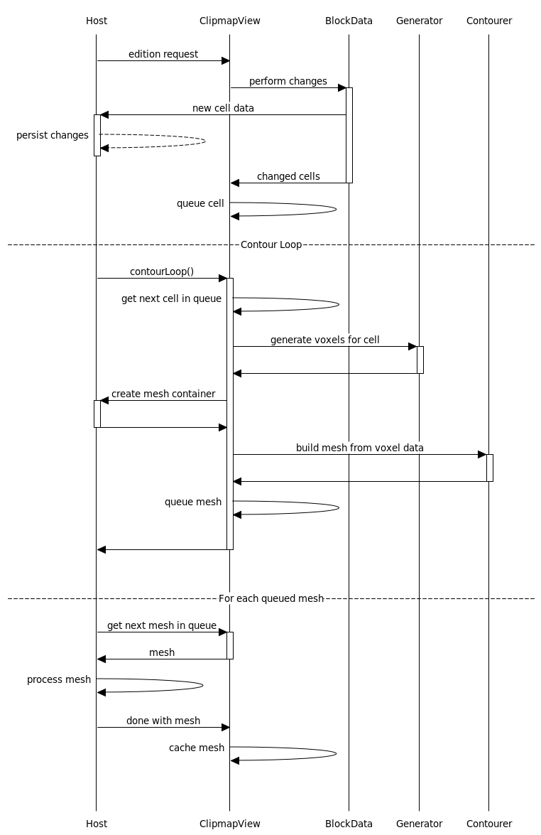 The CClipmapView also allows to change voxels. The changes are stored in a CBlockData instance that is associated to the CClipmapView. This object also implements the IVoxelLayer interface and is referenced by the CGenerator object. This is how the user voxels make it to the final voxel output for the world.