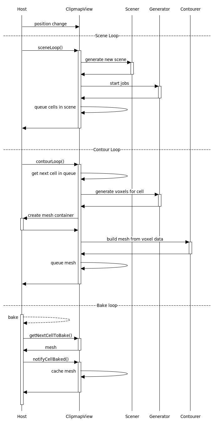 The sceneLoop() method should be called by the host application whenever it desires the CClipmapView to discover the need for a new scene. If a new scene is required, the function queues the cells that require geneneration.