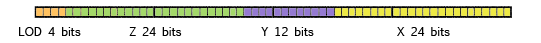 The LOD coordinate can be expressed with only 4 bits. The reason behind this is LOD coordinates are used only for displaying. 4 bits allow 16 LOD. The size of a LOD15 cell can be computed as: