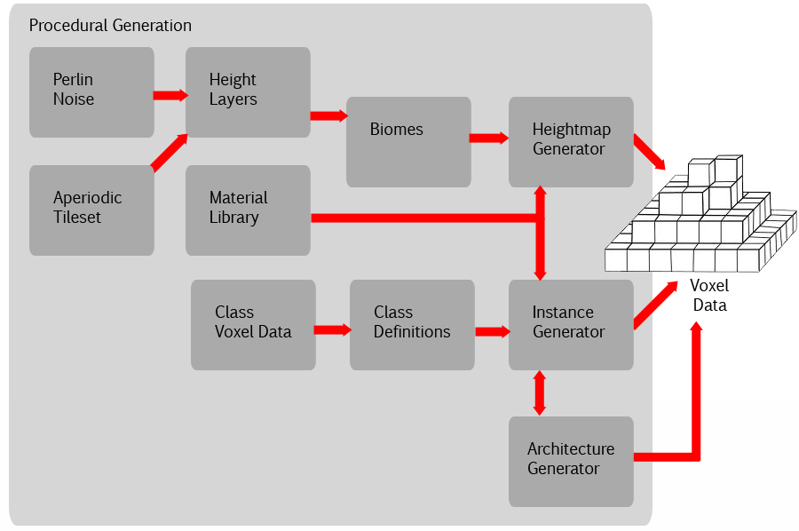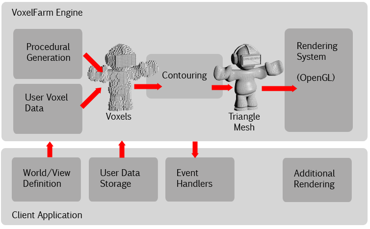 The engine first evaluates the procedural generation functions. These functions produce voxel data. The resulting voxels are mixed with voxels that may have been defined by the user, as the application may allow some form of voxel edition.