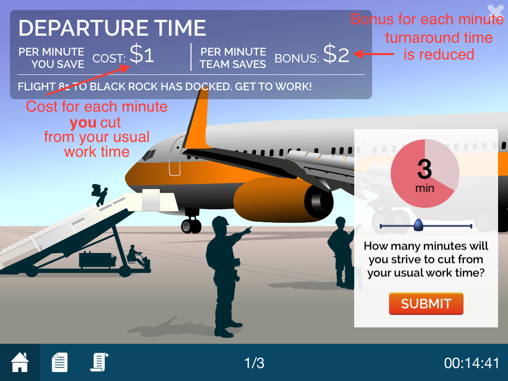 For each plane, each team member simultaneously chooses an effort level: how many minutes to reduce her usual work time.
