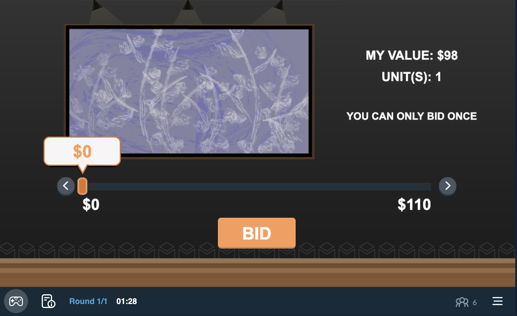 - Use the slider to choose a bid amount, then click Bid to submit the bid