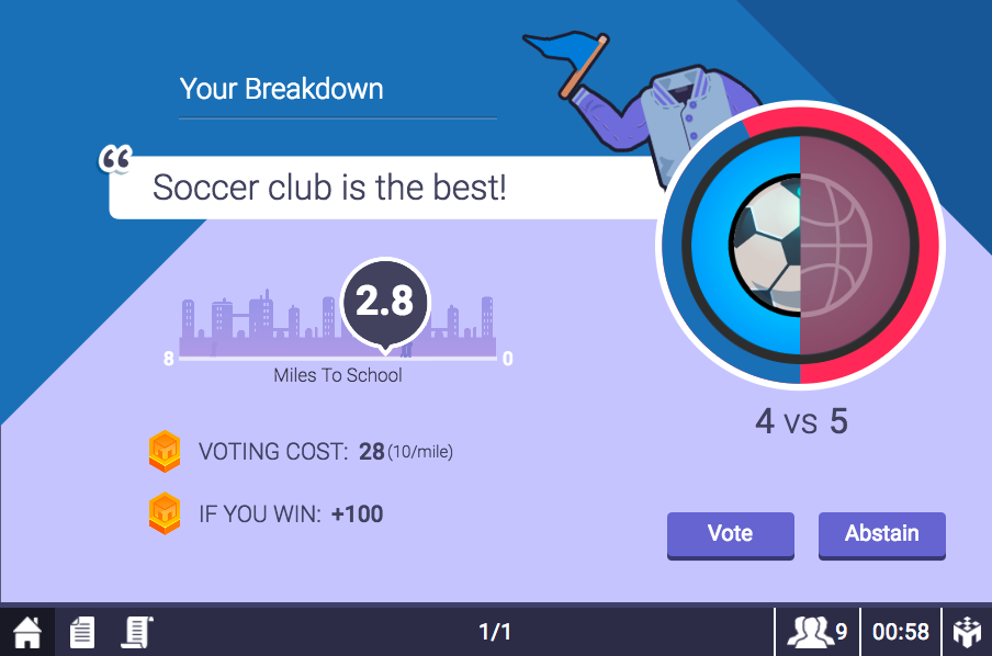 For each group member, voting is costly. Voting cost is determined by distance from the school. This cost is only incurred if an individual votes and there is no direct cost from abstention. You receive 100 points if the number of votes meets or exceeds the minimum threshold and 0 points otherwise. This leads to six payoff situations: