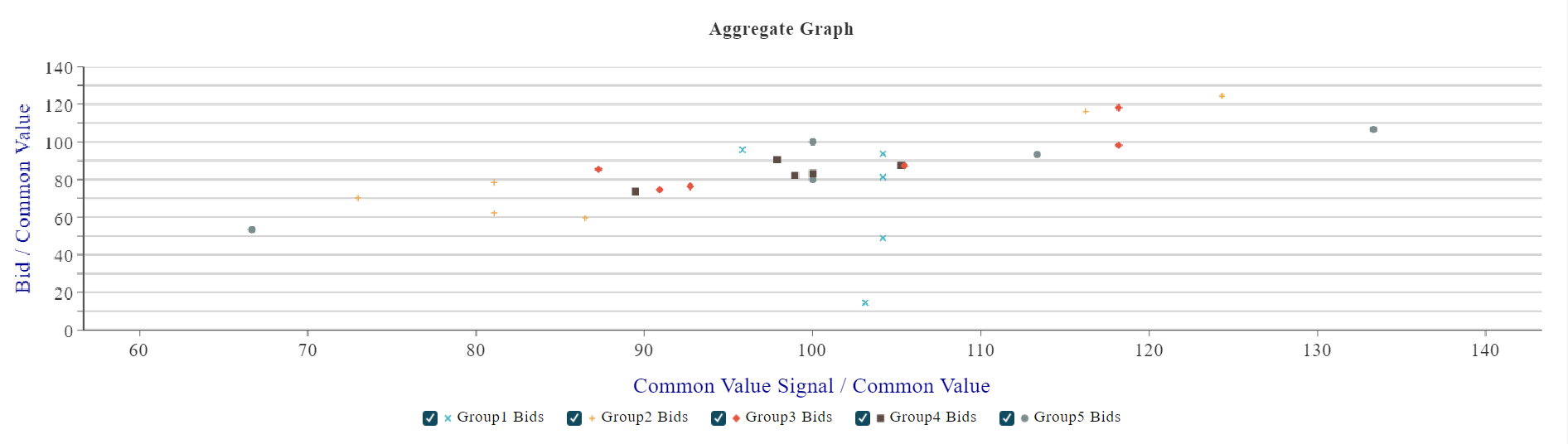 Finally, we present a graph showing aggregate bids by common value signal across groups, normalized by the common value of the auction item. You can toggle which group's results are shown on the graph. Click on the check box next to a group name in the graph legend to remove that group's bids.