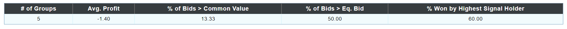 We first present a table summarizing bidding behavior and outcomes (Figure 1). We display the number of groups, average profit, percentage of bids greater than to common value, percentage of bids greater than the equilibrium bid, and the percentage of auctions won by the highest signal holder.