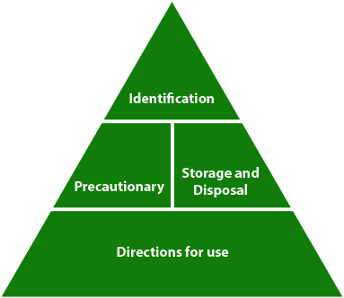 Pesticide labels can be formated differently, but they must have some basic information. Below is a pyramid diagram showing the four areas that all labels must have.