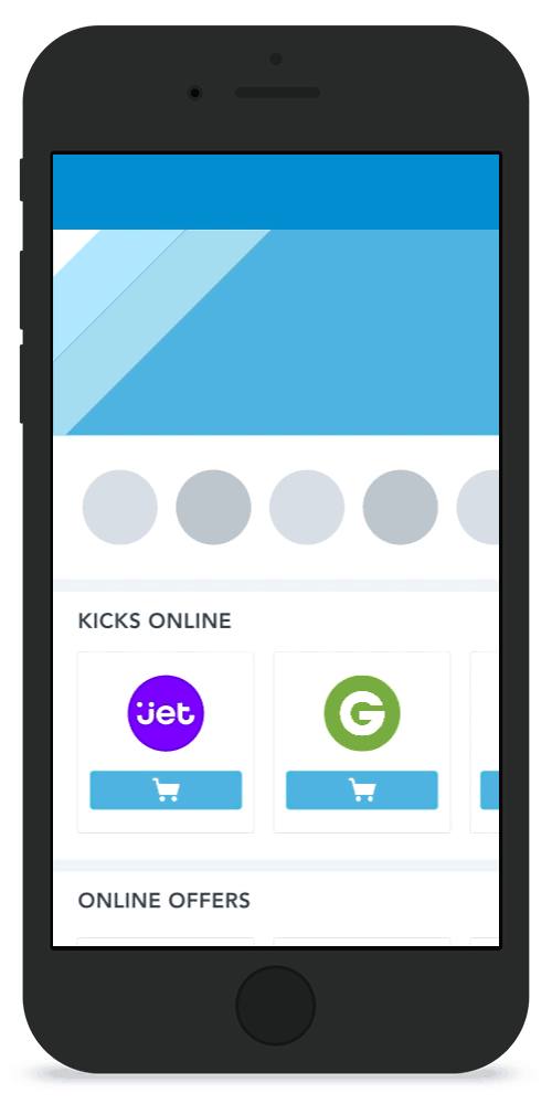 If an online offer has kicks for viewing available, the icon will appear in blue wherever you see it in the app. To earn your kicks for viewing tap “Shop Now” on the offer you would like to view and your kicks will be awarded as you visit the online offer.