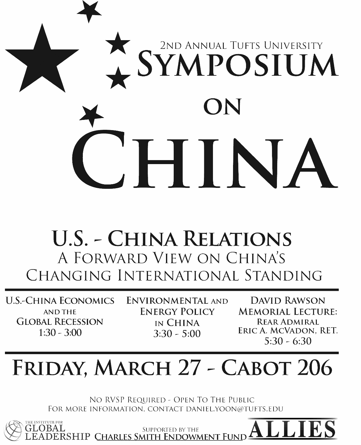 David Rawson Memorial Lecture: Rear Admiral Eric A. McVadon, Ret. 5:30pm - 6:30pmNo RVSP Required - Open to the Public For more information, contact daniel.yoon@tufts.edu *Institute For Global Leadership *Supported by the Charles Smith Endowment Fun *ALLIES