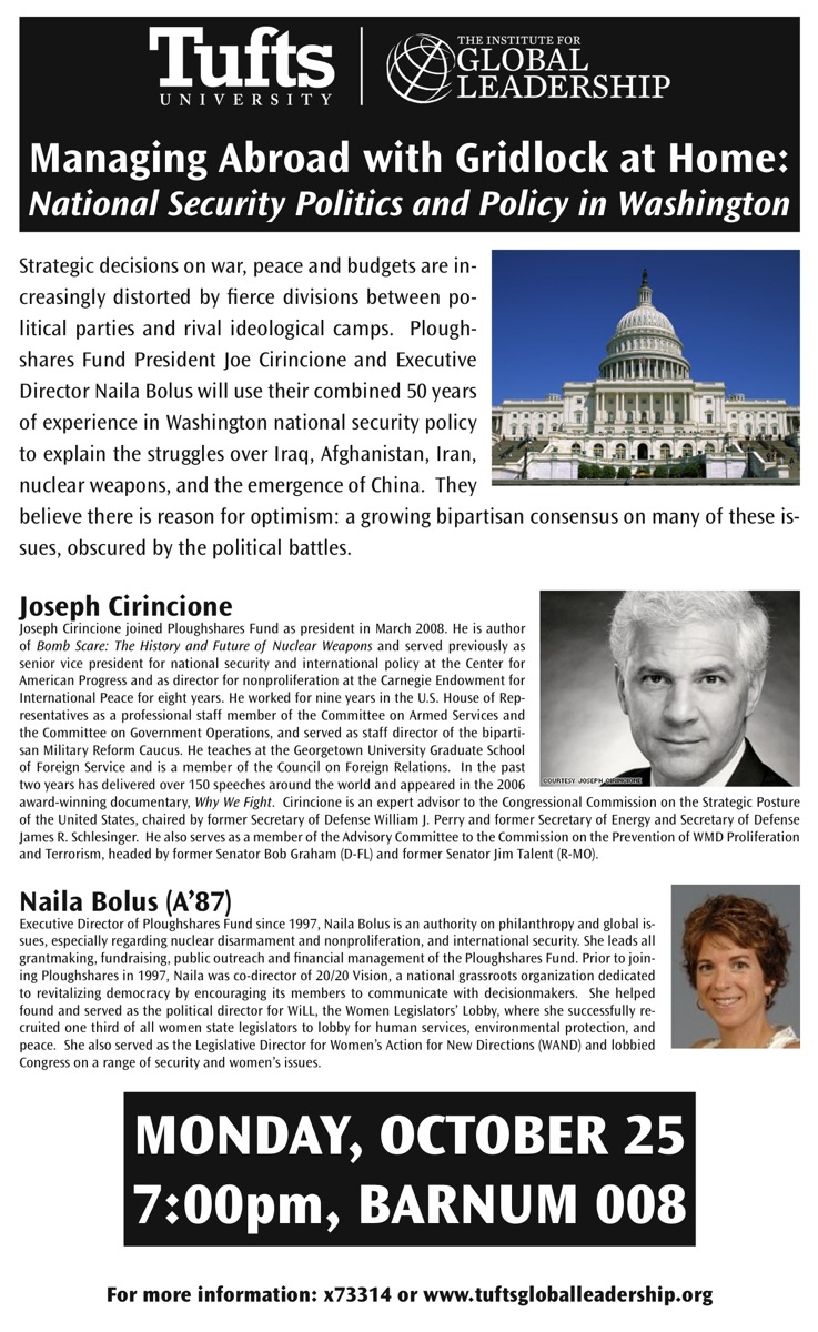 Strategic decisions on war, peace and budgets are increasingly distorted by fierce divisions between political parties and rival ideological camps. Ploughshares Fund President Joe Cirincione and Executive Director Naila Bolus will use their combined 50 years of experience in Washington national security policy to explain the struggles over Iraq, Afghanistan, Iran, nuclear weapons, and the emergence of China. They believe there is reason for optimism: a growing bipartisan consensus on many of these issues, obscured by the political battles.