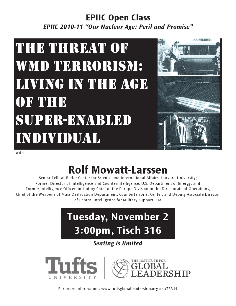 On Tuesday Nov. 2nd, the EPIIC Colloquium will be hosting Rolf Mowatt-Larssen from the Belfer Center for Science and International Affairs at Harvard University for a presentation on the potential for terrorist groups to both acquire Weapons of Mass Destruction and use them to carry out attacks around the globe.