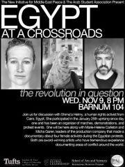 A discussion with an Egyptian female online activist and participant of the Tahrir Square protests. We heard about this opportunity from a former Tufts student and IGL member, who is now interning with a film production company that made a documentary about four female activists during the protests. One of the activists, Shima'a, is coming to the U.S. to give a series of talks along with the two leaders of the production company..., who are both renowned writers and filmmakers.