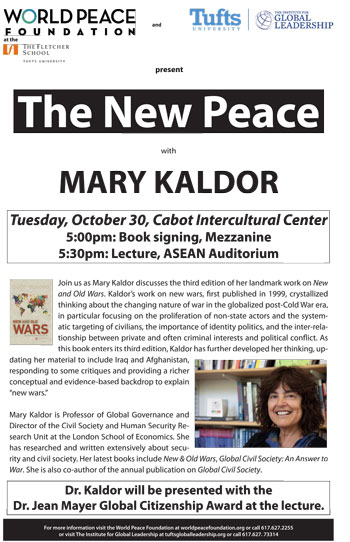Join us as Mary Kaldor discusses the third editiong of her landmark work on New and Old Wars. Kaldor's work on new wars, first published in 1999, crystallized thinking about the changing nature of war in the globalized post-Cold War era, in particular focusing on the proliferation of non-state ators and the systematic targeting of civilians, the importance of identity politics, and the inter-relationship between private and often criminal interests and political conflict. She is Professor of Global Governance and Director of the Civil Society and Human Security Research Unit at the London School of Economics, and will be presented with the Dr Jean Mayer Global Citizenship Award at this lecture. The book signing will begin at 5 pm in the Mezzanine area, and the lecture will take place at 5:30 in the ASEAN Auditorium.