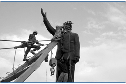 U.S. Marines celebrate with the Iraqi people as they enter the center of Baghdad and help topple a statue of Saddam Hussein in 2003.