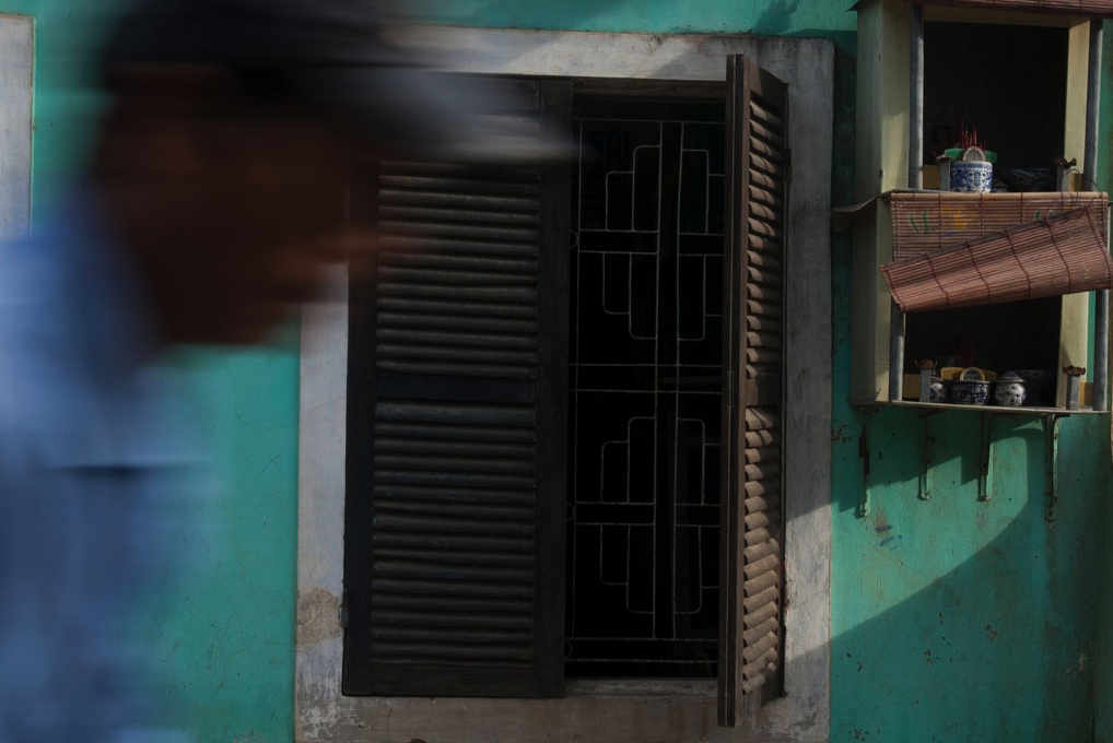 In the town of Bao Binh, a man walks past a shrine, July 2010.