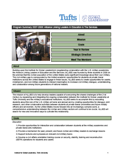 Some of the IGL’s most interesting and effectual endeavors arise from projects created by the eclectic array of student groups initiated within the Institute. The program summary, implemented in a standardized format for the first time in the 2007-2008 academic year, is intended to encapsulate the purpose, goals, and accomplishments of the student groups throughout the year. The program summary is as much a tool to encourage reflection and strategic planning within the student group as it is a medium to describe the group to the outside world, other students, collaborators, and donors.