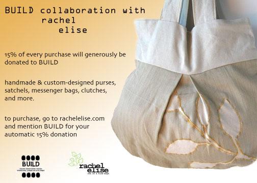 Shop at rachelelise.com for custom designed and handmade purses, messenger bags, clutches, and more! Mention BUILD and 15% of the proceeds will benefit our projects in Guatemala and India.