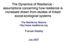 Frances Westley: The Dynamics of Resilience - assumptions concerning how resilience is increased drawn from studies of linked social-ecological systems The Resilience Alliance http://www.resalliance.org
