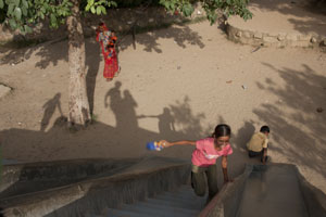 13 year old Javed reads the namaaz in his tender voice. His younger sisters, Heena and Khushboo jump excitedly and join their hands in prayer when we pass a temple. Javed gives Prasad (offering) to the Hindu priest while both girls wear their nakabs. Heena tells me how the maulvi at the masjid teaches the children to be good, while Khushboo dances to Maiyya Yashodha Ye Tera Kanhaiya (song in praise of Lord Krishna).