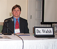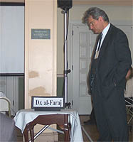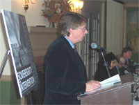 | | Sherman Teichman directs a question to Sami al-Faraj who appeared at the symposium via telephone hook-up. |